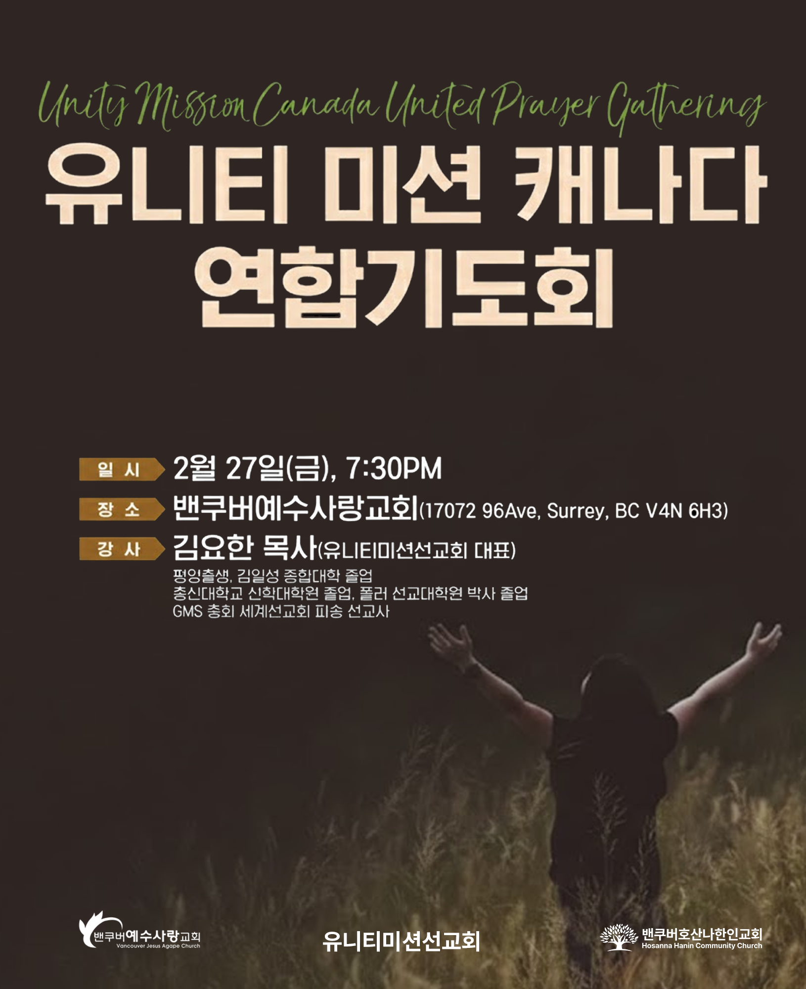 밴쿠버의 모든 성도가 기도로 연합하는 이 뜨거운 현장에 호산나교회 성도님들을 초대합니다.